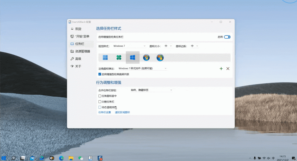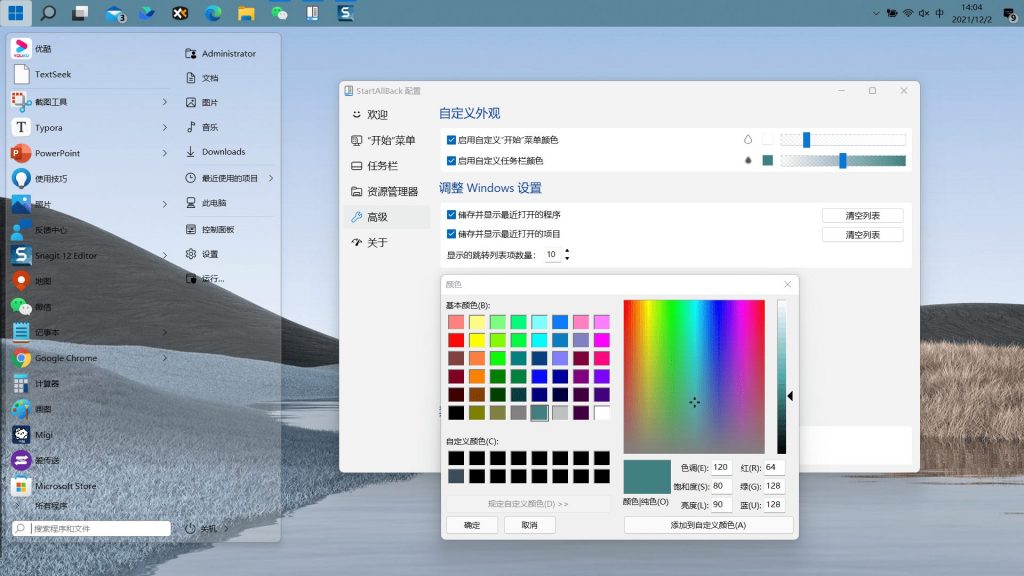 喜欢自定义界面颜色风格的朋友,StartAllBack 为你准备了专业的调色板,并提供透明度和模糊效果调节。任务栏还可设置动态半透明效果,美化恰到好处。作为一款系统美化工具,它做到了占用资源小、运行流畅易上手,给人带来简洁方便的使用体验。